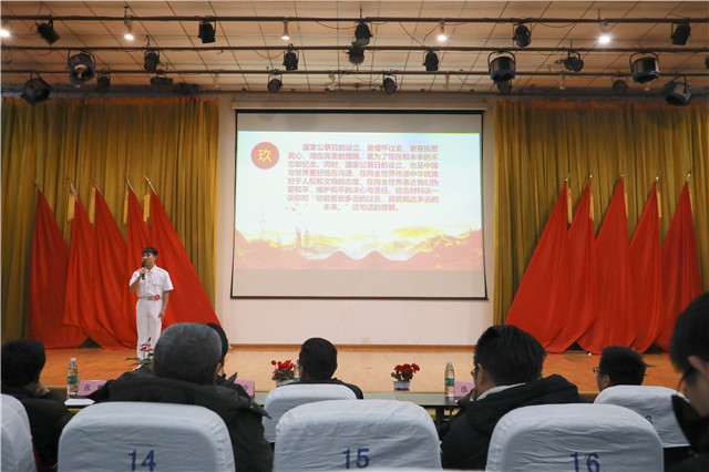 40载物转星移、岁月如歌。为庆祝改革开放四十周年、“一二.九”爱国学生运动以及国家公祭日,切实加强思想政治教育工作,积极践行社会主义核心价值观,2018年12月13日,我院团委在报告厅举办了“风雨砥砺,笃志前行”我是演说家决赛。出席本次活动的嘉宾有:学院党委书记、院长周庆礼,副院长刁爱军,副院长孔德丽,学院关心下一代工作委员会常务副主任顾益明以及各系部党支部书记,团总支书记。出席本次活动的评委有:学院党委工作部主任周启国、党委工作部副主任张玥、蓝岛创客空间副主任王国珍、学生工作处处长助理殷凯、图书馆馆长助理张翼。决赛由吴沁洋、浦子悦担任主持。