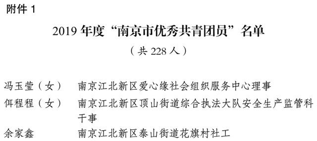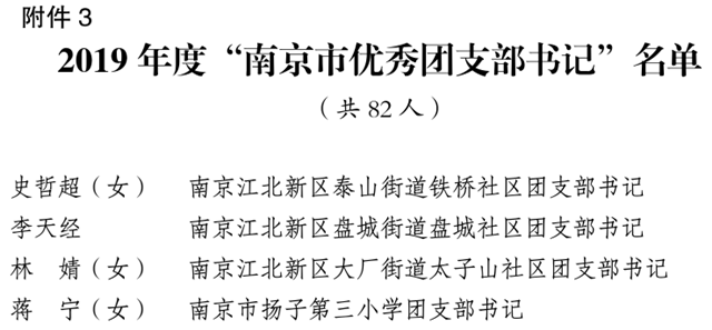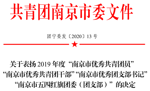 2019年以来,全市各级团组织、团干部和广大团员青年坚持以习近平新时代中国特色社会主义思想为指引,认真学习党的十九大和十九届二中、三中、四中全会精神,深入贯彻习近平总书记系列重要讲话精神特别是关于青年工作的重要思想,紧紧围绕全市建设“创新名城、美丽古都”的总体定位,以“建设青年身边的共青团”为目标,狠抓基层建设、服务中心大局,为南京高质量发展走在全省前列汇聚青春力量,团的各条战线涌现出一大批优秀个人和先进组织。