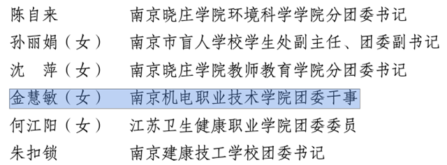 为表扬先进,树立榜样,引导和激励全市广大团员、团干部和各级团组织奋发进取,再创佳绩,共青团南京市委决定授予我院机械工程系苏晨曦同学、人文社科系孙言同学、人文社科系李宇通同学“南京市优秀共青团员”称号,团委金慧敏老师“南京市优秀共青团干部”称号,机械工程系姜超同学“南京市优秀团支部书记”称号。