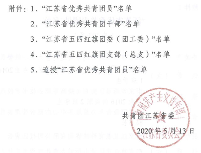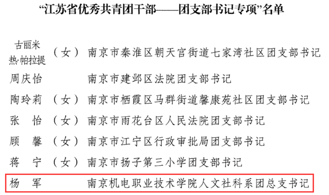 为表彰先进典型、树立标杆榜样,引导和激励全省广大团员、团干部和各级团组织奋发有为、再创佳绩,共青团江苏省委决定,授予我院杨军老师“江苏省优秀共青团干部——团支部书记专项”称号。