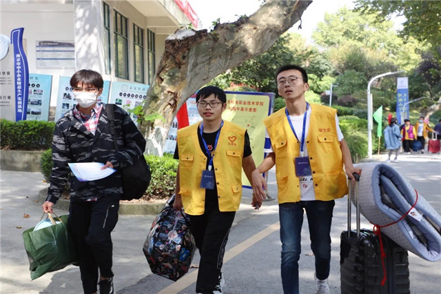 我们的老师也加入其中,帮助同学们将重行李运送到宿舍,志愿者们“五颜六色”的身影,在校园里无数次奔波,他们耐心负责,他们认真热情。在这里,对所有可爱的志愿者们说一句:“谢谢,你们辛苦了。”