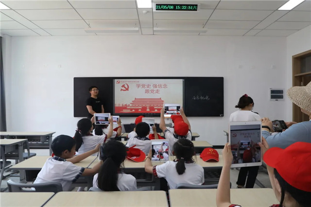 来到教室后,院团委志愿服务部部长罗宏伟为同学们演示了多媒体教室的教学设备,对同学们进行了党史学习教育。教室里传来齐刷刷的朗读声:“学党史,强信念,跟党走”!稚嫩的童声回荡在教室里。