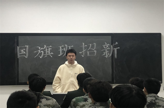 21级新生们根据抽签顺序轮流上台进行自我介绍,各展所长——有人因为家中祖辈三代参军,从小受家庭氛围熏陶,加入国旗班的想法在心中萌芽;有人因为高中便是国旗护卫队中的一员,进入大学也想让这一情怀激荡自己的奋进之路;有人巾帼不让须眉,被军人飒爽的英姿折服后,想进入国旗班奉献自己的一份力量......
