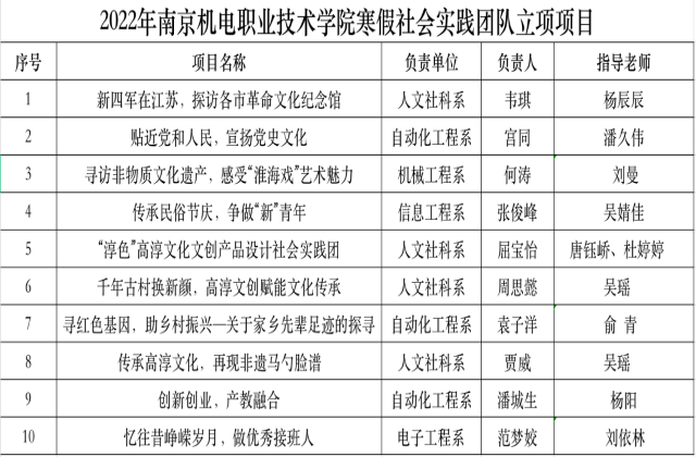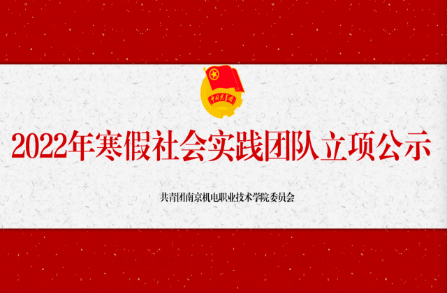为深入学习贯彻习近平总书记在庆祝中国共产党成立100周年大会的重要讲话精神,进一步推动爱国主义教育与实践育人工作深度融合,引导机电学子以强国一代新青年的良好精神面貌迎接党的二十大胜利召开,庆祝中国共产主义青年团成立100周年。团委决定开展“小我融入大我,青春献给祖国”2022年星空网页版登录入口大学生寒假社会实践活动。经自主申报,各团总支、青马班审核推荐,校级专家评审,确定以下10个项目为2022年星空网页版登录入口寒假社会实践团队立项项目,并对立项的项目给予经费支持,现公示如下: