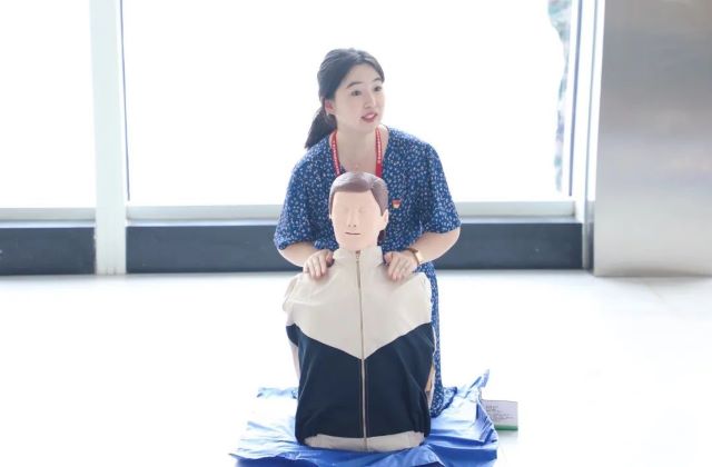 在培训过程中,金老师用浅显易懂的语言,围绕日常生活中可能发生的突发事件与相关急救措施,与同学们展开交流互动。接着通过现场演示,金老师深入浅出地讲解了心肺复苏、AED使用等急救处理知识,并利用“模拟人”对心肺复苏的过程进行了现场分解演示,让同学们准确领悟了“心脏按压”“人工呼吸”等技能的要点。