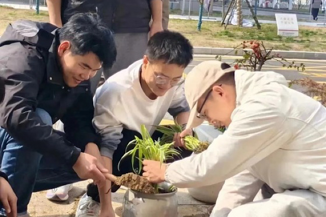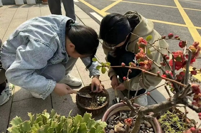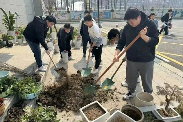 袅袅春风三月天,移花种树恰当前。同学们分工合作,从挥锹铲土,到选取花盆放苗回填、浇水灌溉等,每一个环节都一丝不苟,活动现场到处是同学们热火朝天的忙碌身影和体验劳动的欢声笑语。经过同学们的共同努力,一棵棵月季苗玫瑰苗,芍药、玉树、紫荆花、茉莉花都花盆里安了家,迎风而立在校园中,错落有致、萌发出盎然生机。
