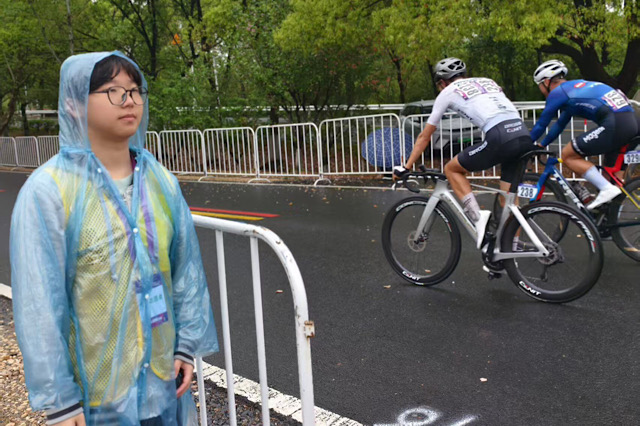 赛道沿线,每隔一段距离就有身着鲜艳志愿服的同学们挺立坚守。于赛前清理赛道上的障碍保持赛道封闭,如遇摔车等突发状况,及时通知取得救援。即使面对台风的侵袭也依然用双手扶住赛道两旁的护栏,防止倒塌砸伤高速行驶中的运动员。在终点区域,志愿者们的热情与风雨形成鲜明对比他们呐喊助威,为冲刺的运动员送上最炽热的欢呼。