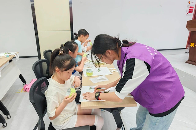 上午场,大学生志愿者们来到古柏街道新城社区。在这里,他们带领孩子们开启了一场传统与创意交织的拓印之旅。志愿者详细地给孩子们讲解拓印的历史、原理和方法,孩子们听得津津有味,眼中满是好奇与期待。在实践环节,孩子们精心挑选自己喜爱的树叶,小心翼翼地将其放在帆布包上,然后用颜料、小刷子等工具,认真地进行拓印。不一会儿,一幅幅充满童趣的树叶拓印帆布包就诞生了,孩子们看着自己的作品,脸上洋溢着自豪的笑容。