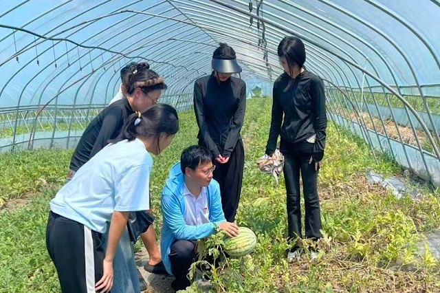 刚到农场,联溪村书记王国辉便和瓜农一同领着团队走进瓜棚。棚内虽炎热,大家却听得专注:王国辉与瓜农一边指着藤蔓上的西瓜讲解种植细节,从瓜苗养护到结果管理逐一说明,还分享了高温天给西瓜遮阳、合理浇水的护瓜技巧,让团队切实摸清了西瓜的品质由来。