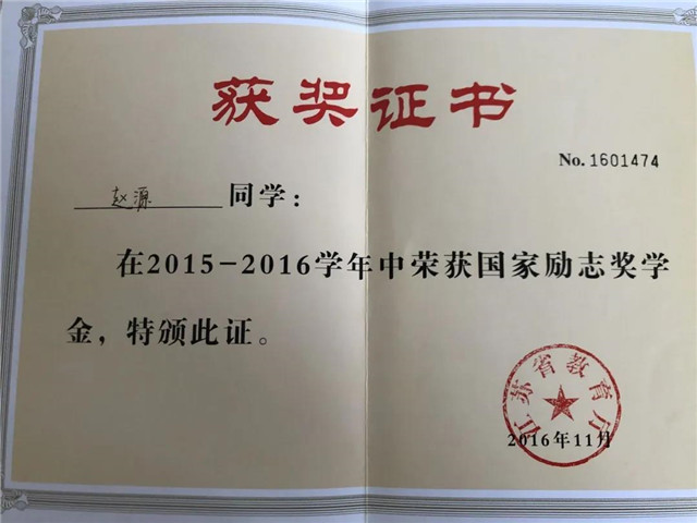 2015—2016学年:“三好学生”、“优秀共青团员”、“国家励志奖学金”;