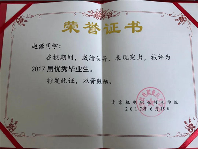 毕业后的我,十分怀念在南京机电的学习生活。我认为大学生一定要有自己的人生方向,切不可碌碌无为,虚度青春。大学期间,我对电子电路比较感兴趣,因此我经常参加创客周末和创客激荡夜等活动;同时,我利用课余时间考取了安全电工和维修电工等证书。