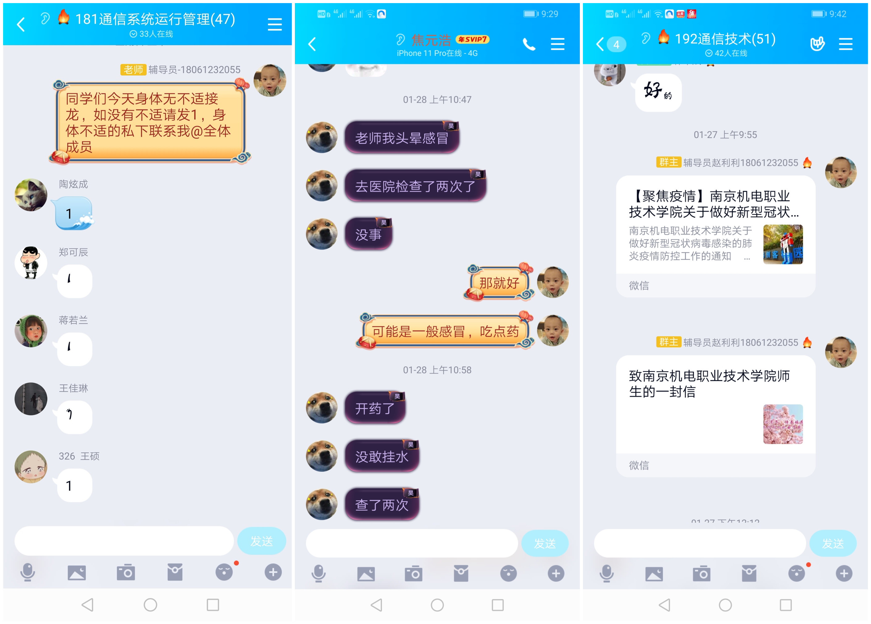 为了准确掌握每个同学在家的信息,我们实行班级打卡制,每日上报自己身体情况。每天早上八点,全班同学在班级群里接龙打卡,身体有感冒、发烧等症状同学私下联系辅导员。每天上午12点辅导员将自己和所带班级学生情况上报系部。为了让学生对这次新型冠状病毒以及日常防护有更多的了解,班级群里定期推送星空网页版登录入口学工处的相关文章,指导学生对疫情有正确认识,同时加强自身防护。指导大一大二学生安装超星软件,为网络授课做准备。