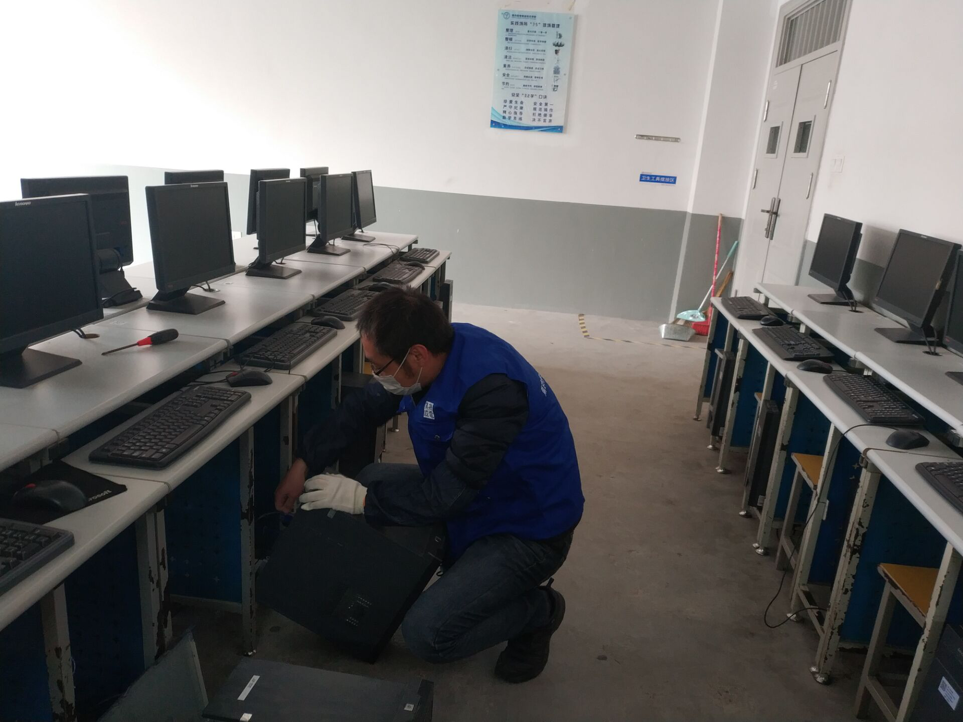 通过参与人员的通力配合,经过两天高效的工作,完成了我系实训中心所辖300余台计算机设备的除尘维护任务,做好了新学期开学前的设备维护工作。