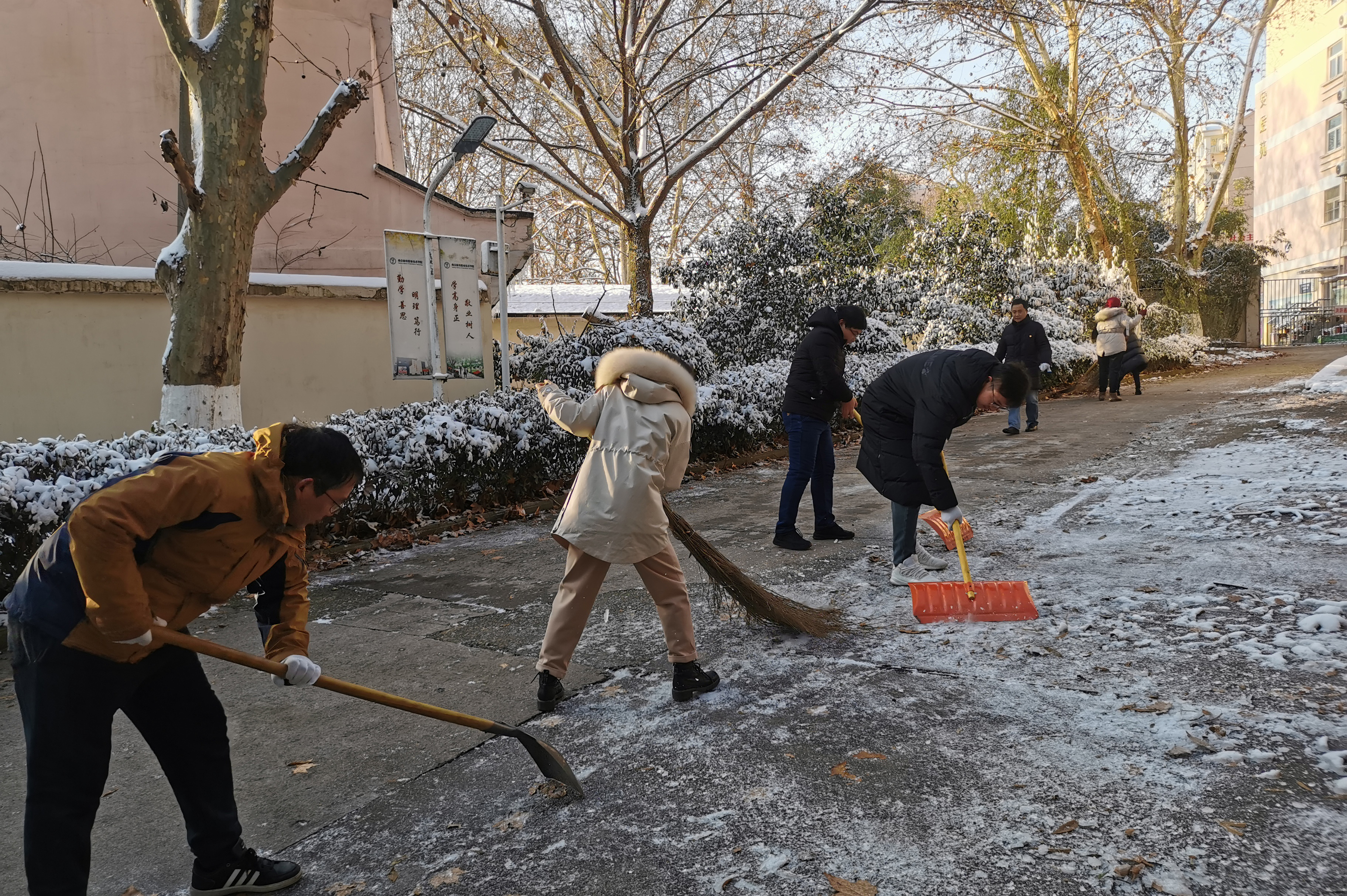 12月30日清晨,一场大雪后,星空网页版登录入口校园内银装素裹,美丽的雪景,让人欢乐的同时也给师生的出行带来诸多不便,虽然前一天晚上后勤等相关单位已经对学院的主干道做了清扫,但是天气寒冷,有一些路面还是冰冻严重,为确保全校师生的在校安全和教育教学的正常进行,信息工程系的教职工早早的来到校园,有秩序地投入到了扫雪除冰的活动中。