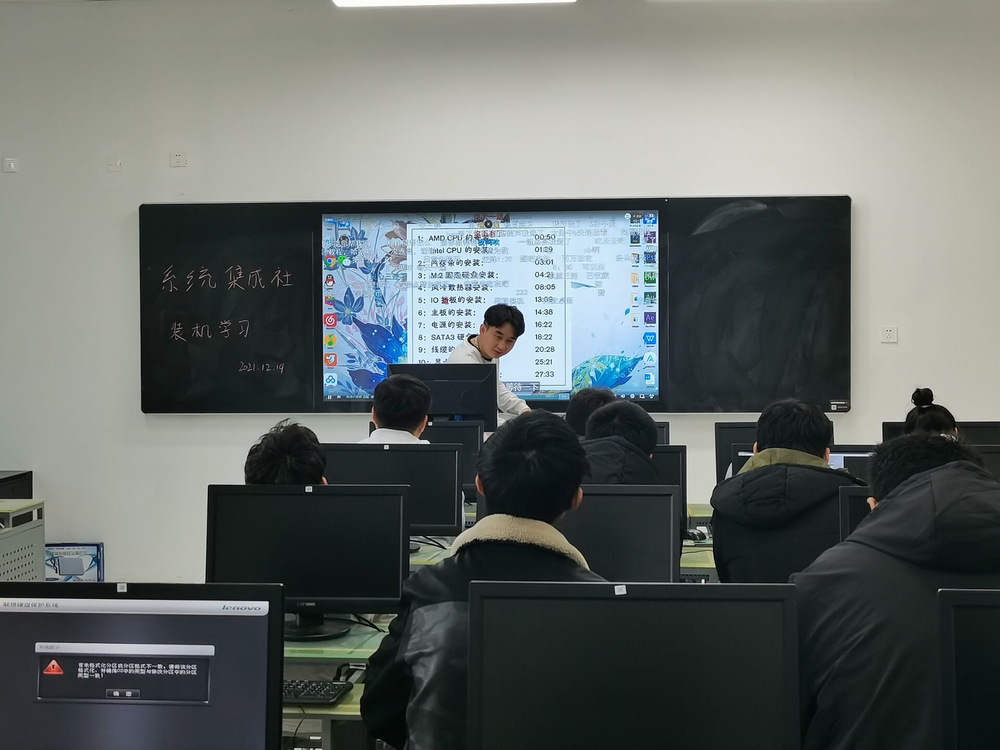 随后,对社团成员进行装机知识学习,学习部部长准备好了相关视频,社团成员一同观看了装机视频,学习了主机的各个组件,以及它们如何安装,也了解了市面上相关组件的信息。观看结束,社长对常见的装机问题进行了详细的讲解。