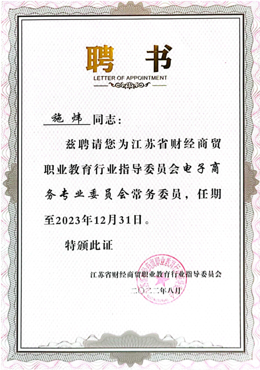 会议中,江苏省人社厅职业能力建设处二级调研员陈彦德强调了职业教育的重要性,指出电商专委员应建立健全政府主导、行业指导、企业参与的职业教育办学机制,强化行业在现代职业教育体系建设和职业教育改革发展中的指导作用。接着,江苏省财经商贸职教行指委副秘书长刘登辉介绍了行指委及6个专委会建设基本情况,希望电商专委会不断探索新形势下行指委工作的新思路、新路径、新模式、新方法,为我省财经商贸类职业教育的高质量发展做出新的贡献。此后,会议审议公布《电子商务专业委员会增补常务委员、委员人员名单》并颁发证书,并由多位专家分享主题报告。最后,专委会各工作组还就下半年工作计划进行了交流和讨论。我校施炜老师被聘任为江苏省财经商贸职业教育行业指导委员会电子商务专业委员会常务委员,郑旻璐老师、陈洁老师被聘任为江苏省财经商贸职业教育行业指导委员会电子商务专业委员会委员。