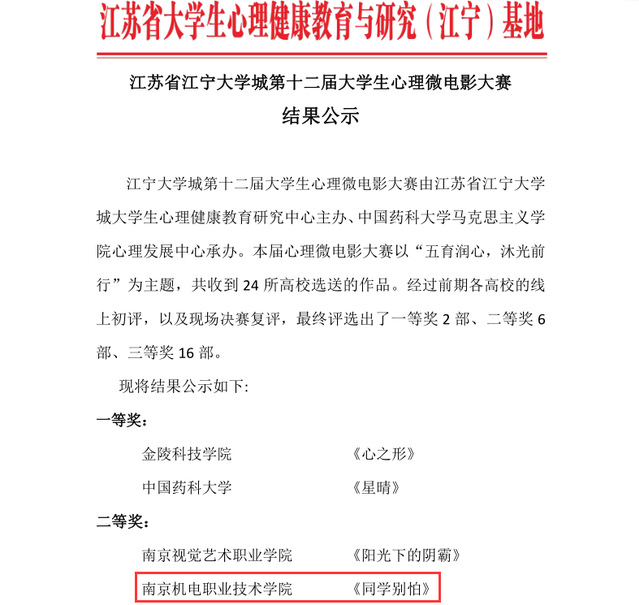 2024年6月7日下午,信息工程系学子参加了中国药科大学举办“江苏省江宁大学城第十二届大学生心理微电影大赛”决赛,本届心理微电影大赛以“五育润心 沐光同行”为主题。经过前期高校教师评委的初评,我系《同学,别怕》这部作品在24所高校的参赛作品中脱颖而出,得到评委老师们的认可,进入决赛荣获二等奖。