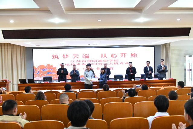 最终,在主会场内,胡枫郑重地为江苏省淮阴商业学校24级无人机班授予了班牌,这一庄严仪式不仅标志着同学们正式踏上了全新的学习旅程,也象征着两校在深化专业建设、优化人才培养方面迈出了坚实而有力的一步。