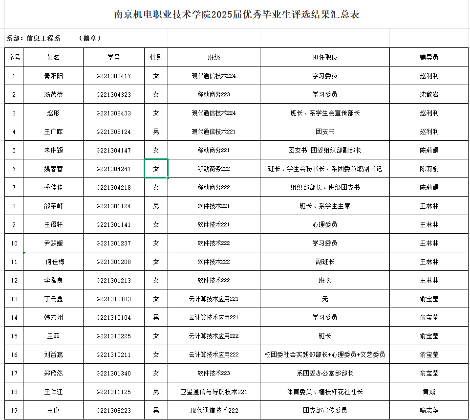 根据《关于评选2025届优秀毕业生的通知》(南机电院学﹝2025﹞4号)文件精神,经班级评选,系部审核,决定拟推荐以下17名同学为2025届星空网页版登录入口优秀毕业生。现予以公示,公示时间:2025年4月24日——2025年4月26日。联系人:郝麒,电话:18061237654。