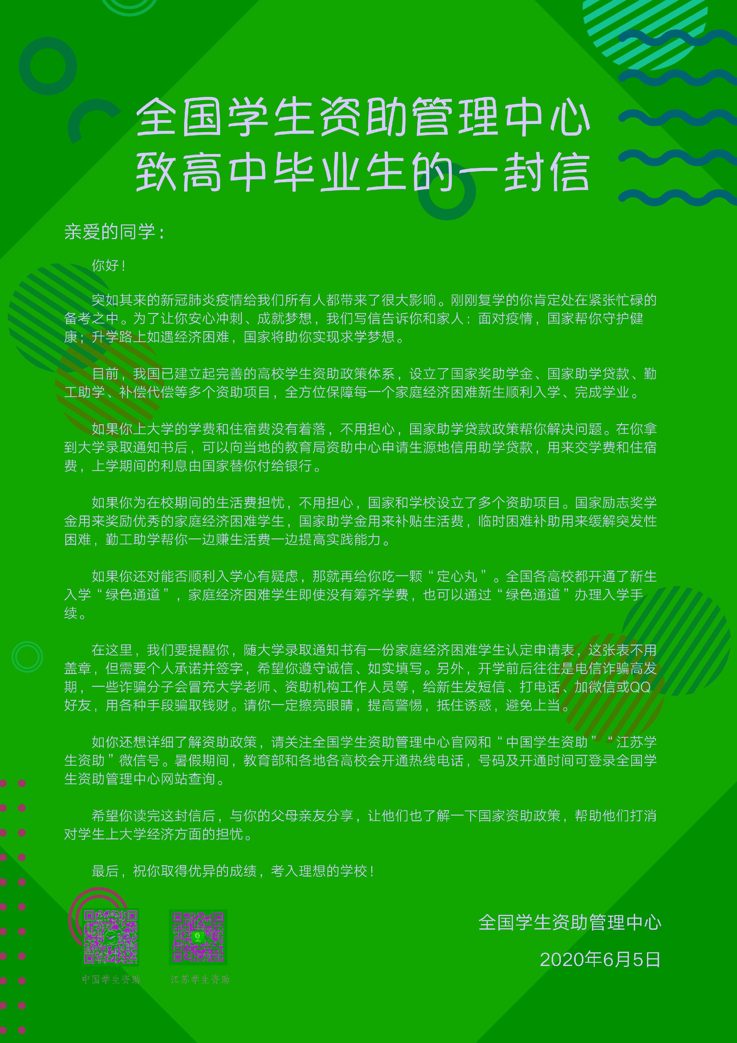全国资助中心致高中毕业生的一封信