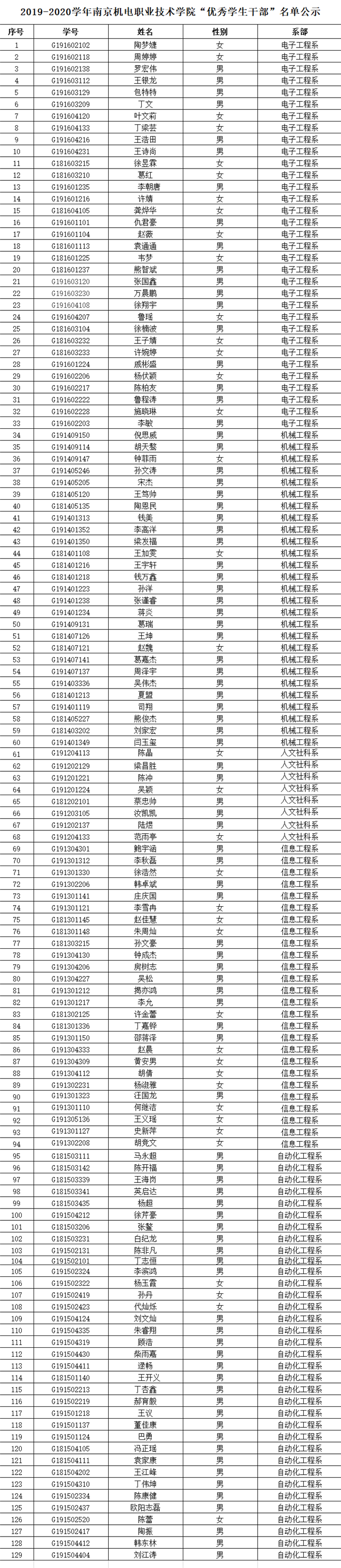 根据《星空网页版登录入口2019-2020学年三好学生、优秀学生干部、文明班级评选通知》规定,经学生本人申请、班级评议,系部审核推荐,学工处核准,学校审批,在公平、公正、公开的基础上,拟评选出以下个人和班级为2019-2020学年星空网页版登录入口“三好学生”、“优秀学生干部”、“文明班级”,现将名单公示如下。