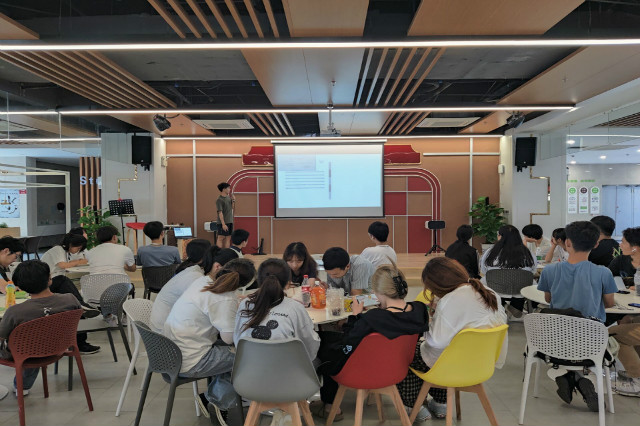 主讲人王浩田与在场同学们分享了自己丰富的校园生活。结合自身双创班的实践活动和比赛经历,鼓励同学们积极参加大型赛事,充分发挥自我才能。随后,他向同学们展示了几张自我社会实践的图片,并向在场同学传授实践经验,他指出“生命若是一本书,人生经历就是书页”,呼吁同学们在实践中积累,在积累中升华。