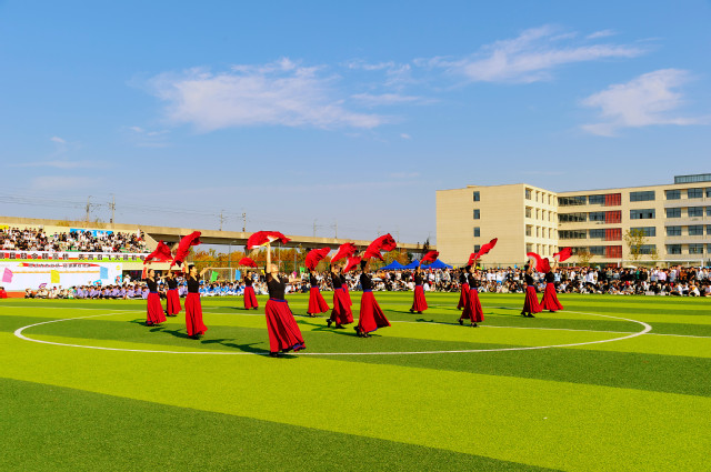 本次开幕式学校有幸邀请到了高淳区武术协会给同学们展示中国优秀的民间艺术——舞龙舞狮表演。接着,同学们欣赏到了由Sunny花绳社和南京新嘉乐共同演绎的“绳采飞扬”花式跳绳表演。我校电子工程系无人机应用技术专业师生操控着两架无人机飞行编队紧随其后,带着学校的办学愿景和办学使命以及对本次运动会开幕的祝福飞来。最后一个表演由教职工带来精彩的舞蹈表演《万疆》,动听的歌声与曼妙的舞姿赢得了同学们的热烈掌声。