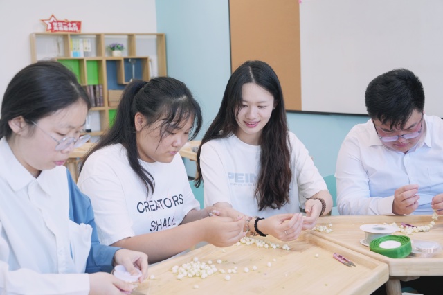入座后,在工作人员的细心讲解和示范下,同学们认真学习,了解每项步骤后,积极发挥创意,从如何穿插花瓣到丝带样式选择,在彼此间的指导帮助中,同学们渐渐地找到了制作的小窍门,专心致志地完成择花、绑丝带、串花等一系列工序,发挥自己的创造力,制作出了属于自己的独特的茉莉花手串,将一朵朵含苞待放的茉莉花用丝带缠绕成腕间的一抹风景。活动现场欢声笑语,千丝万缕的丝线和灵动的手指交织出了青春的美丽图景。