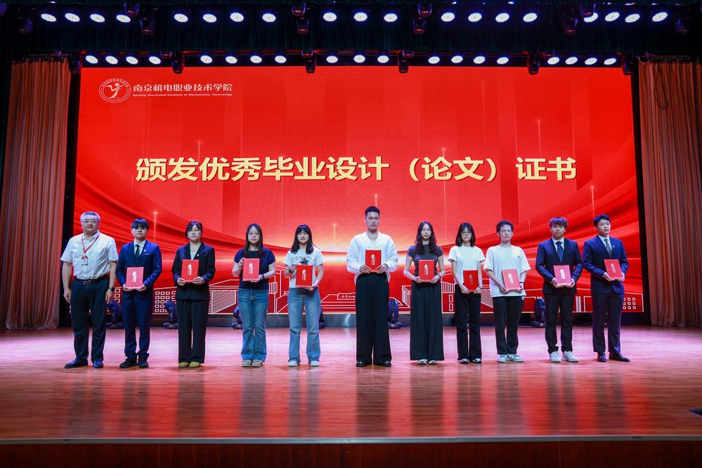 学校国旗班成员迈着铿锵的步伐护送五星红旗入场,全体人员面向国旗行注目礼,齐声高唱国歌。赵学洪宣读2025届优秀毕业生、优秀毕业设计(论文)表彰决定。党委委员、副校长刁爱军颁发优秀毕业设计证书,党委委员、纪委书记、工会主席姜振宇颁发优秀毕业生证书。