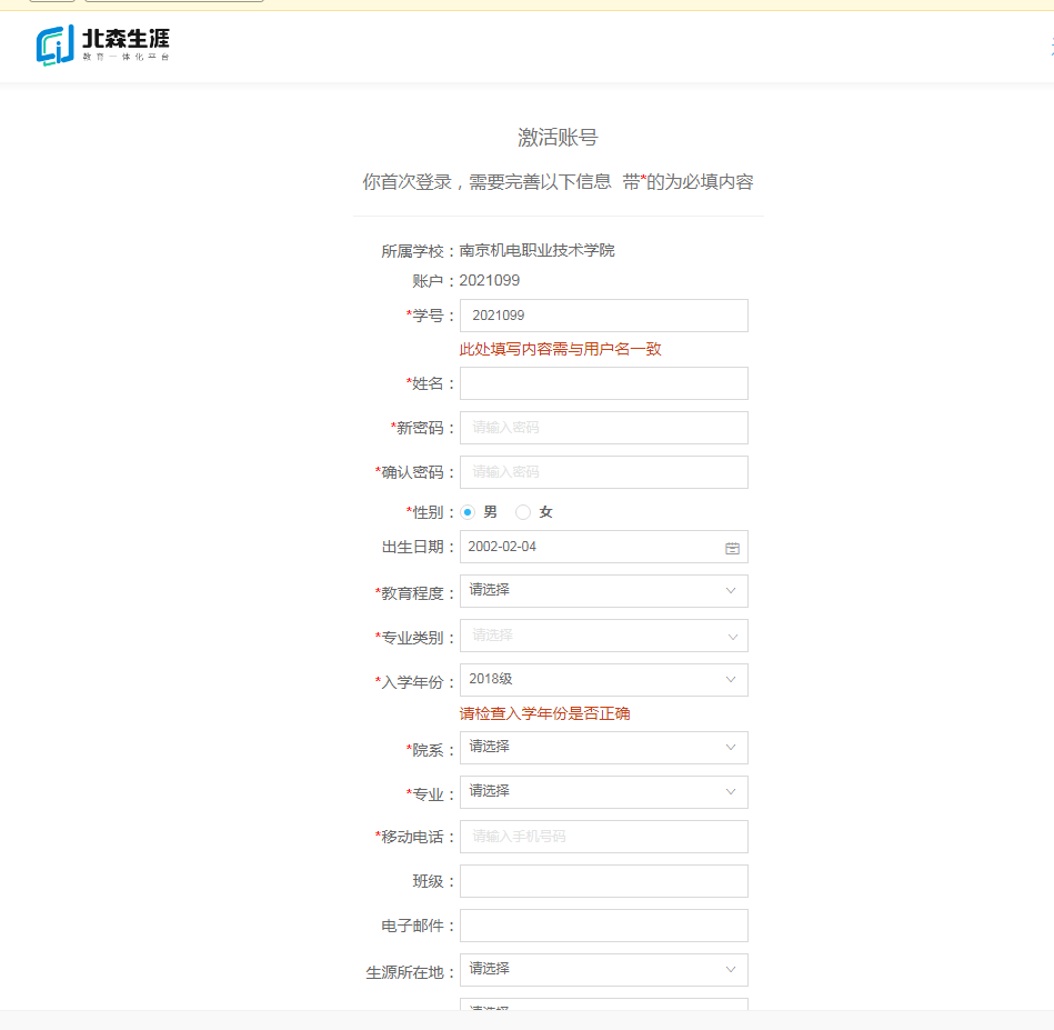 ②输入账号密码,填写*必填信息,激活账号