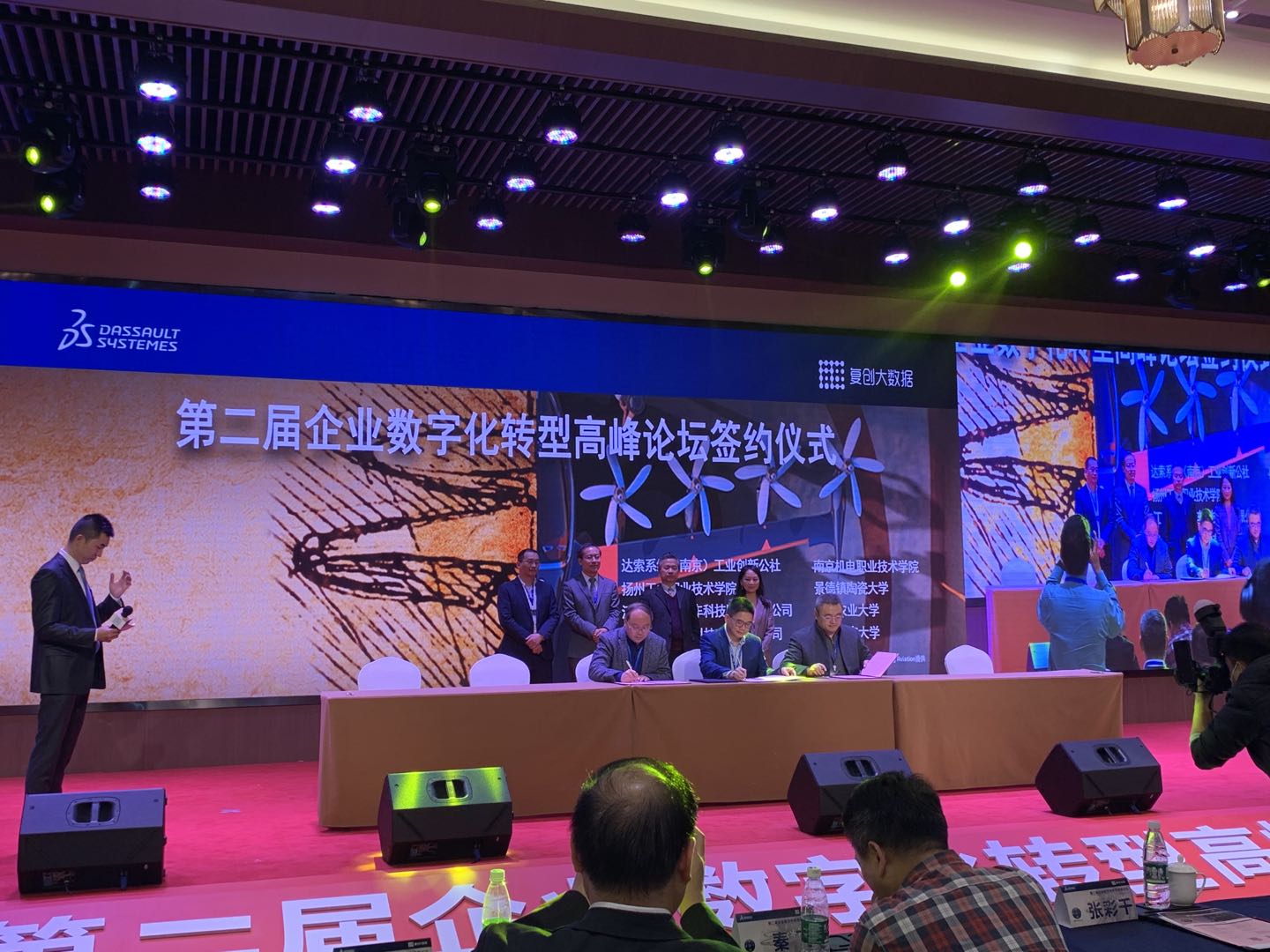 2020年11月25日,世界智能制造大会首场活动——第二届企业数字化转型高峰论坛签约仪式在南京未来科技城举行,签约仪式上,星空网页版登录入口智能制造学院与法国达索系统公司(南京)工业创新公社正式签署产学研战略合作协议,并达成共建南京机电达索创新中心的共识。星空网页版登录入口副院长刁爱军、智能制造学院执行院长潘理平、专业教师吴芬等参加合作签约仪式。