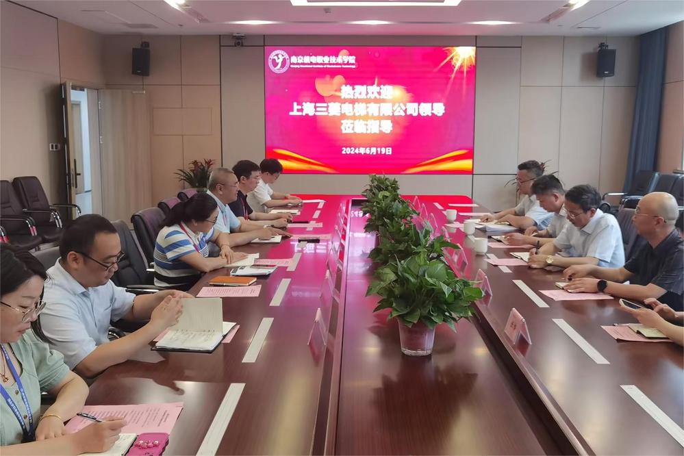 2024年6月19日,上海三菱电梯有限公司华宁路分部总经理王水来、教育培训部教务长朱武标,上海三菱电梯江苏分公司总经理徐刘平等一行莅临星空网页版登录入口,就深化电梯产业学院建设召开校企合作交流洽谈会。学校党委委员、副校长刁爱军、自动化工程系副主任张海红、副主任顾晟吉、党支部副书记杨军、培训处副处长周云龙和科研及校企合作处相关人员参加洽谈会。
