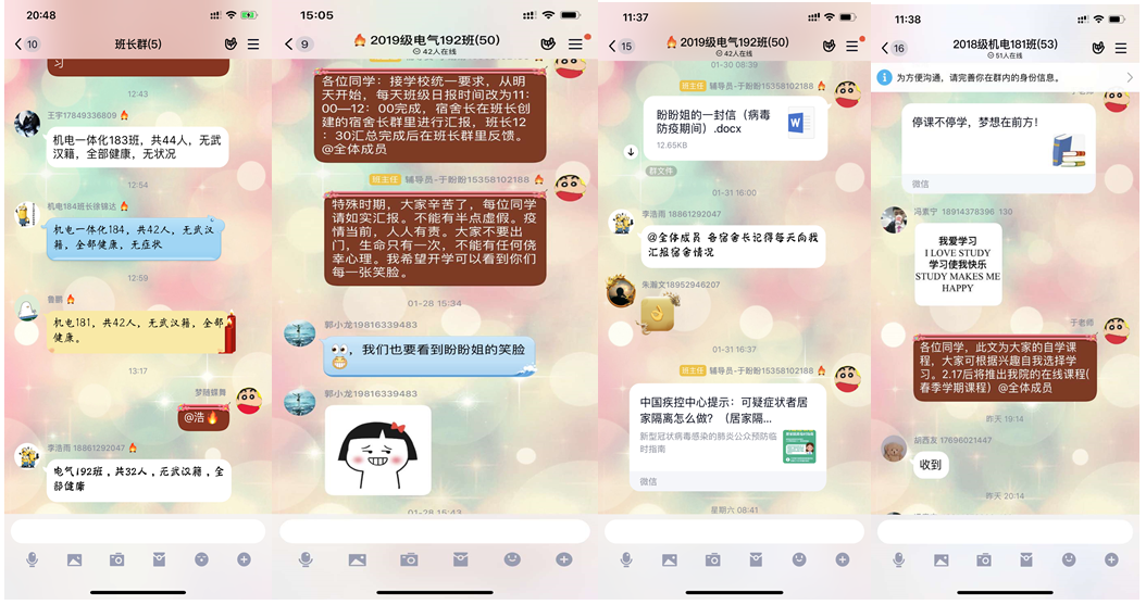 防疫期间,我的骨干班委也发挥了很大的积极作用,帮助我联系同学、询问信息,并主动把有用的学习资料和疫情信息发到群中,让我欣慰的同时更觉得自己工作的意义。