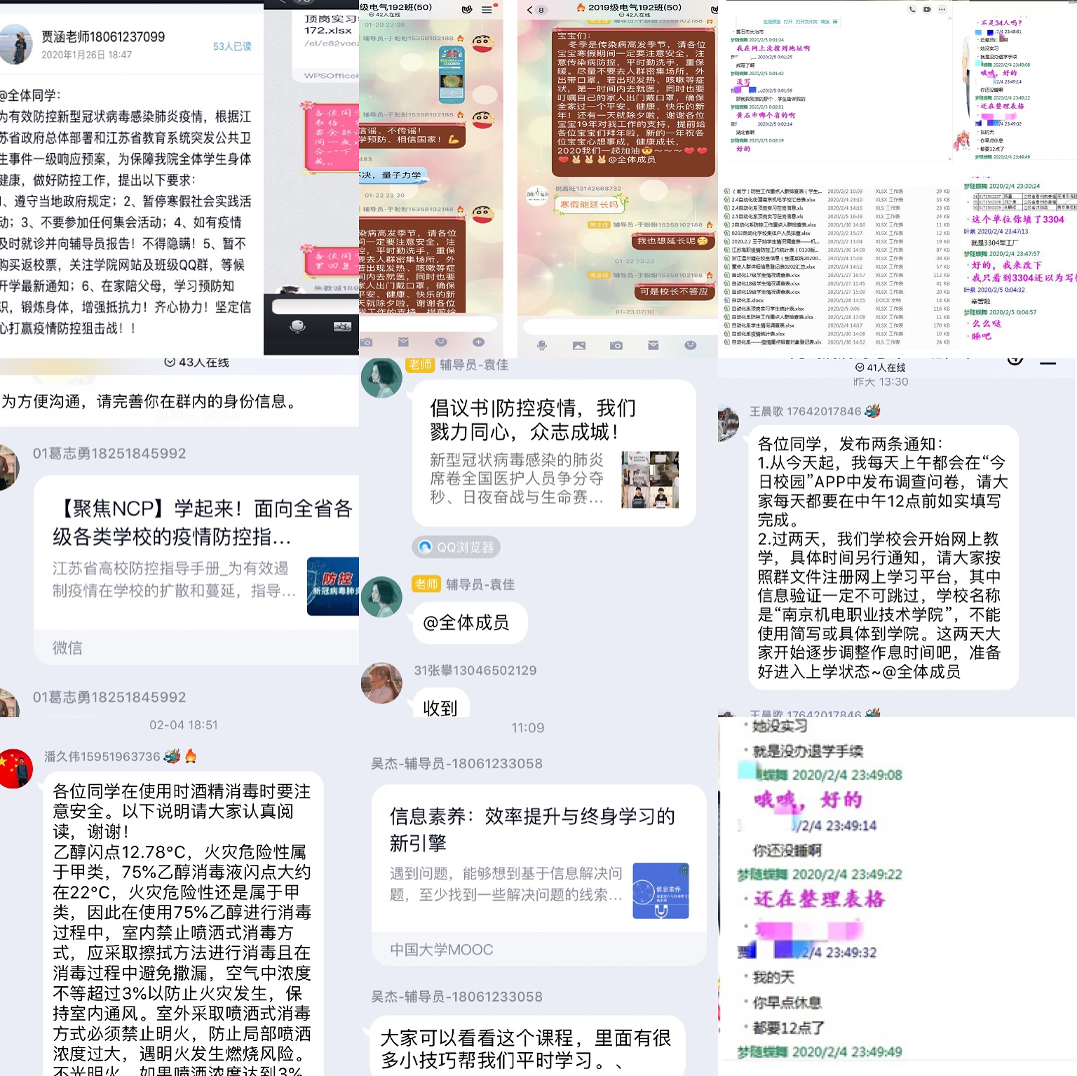 系部建立宿舍长联系“网格家园”,积极发挥学生骨干作用,将宿舍长作为第一道防线,班级管理以点带面,进行织网管理,确保这个网能罩住个人,班委除了自己固定的工作分工之外,还要包户到家,即每一个班委或宿舍长要对接几名学生,让辅导员能持续控制每名学生的信息,做到统一发布信息,统一工作任务、统一行动步骤。以学生宿舍为单位开展对接联系工作,把责任落实到人、任务分解到位,全体学生与班干部密切配合、协同作战,覆盖系部近200间宿舍、1173位同学。利用QQ等渠道每天与同学们展开沟通联络,积极转发权威疫情防控信息,传达学校、系部相关要求精神,督促同学们充分利用时间,通过网络教学平台开展居家学习,引导传递正能量,安抚不良情绪,做好心理疏导;组织辅导员针对湖北籍同学每天进行交流,通过与学生及家人沟通,了解身体健康状况,帮助在鄂学生及家人做好“心理防疫”工作,鼓励他们坚定信心。