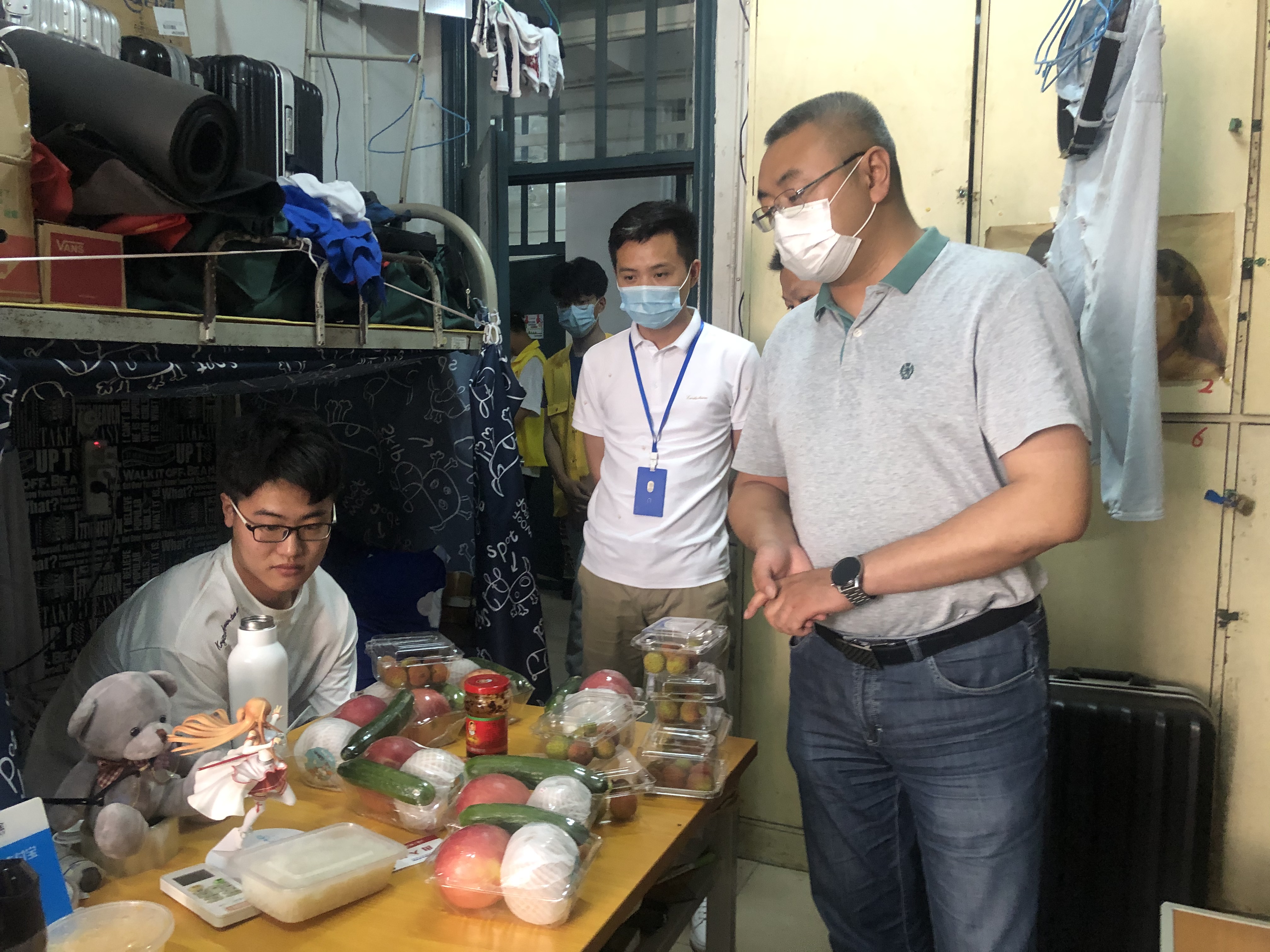 高水冕书记耐心的去往每一个宿舍关心同学们的健康,对于大家的问题也耐心的一一解答。他说,感谢同学们一直以来的理解与配合,系部为大家准备的水果,希望能为这个炎炎的夏天带来一丝微风。走访过程中,学院及系部领导认真倾听学生心声并解答学生困惑。