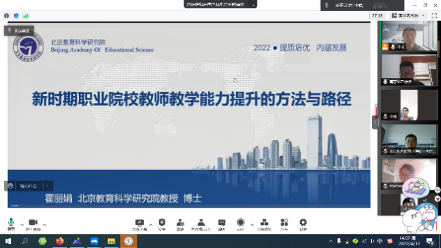 为加强师资队伍建设改革,提升职教师资的教育教学能力以及综合素质,4月12日下午,供用电技术教研室全体教师在线上共同学习关于《新时期职业院校教师教学能力提升的方法与路径》专题讲座,由徐健老师担任主讲人。