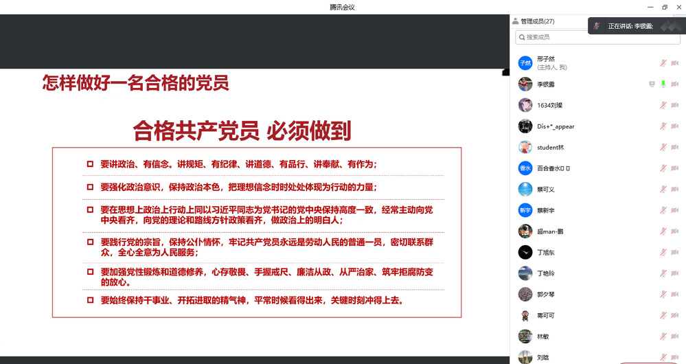 4月19日下午,自动化工程系党支部通过腾讯会议线上开展《做合格党员》政治学习。本次政治学习由李银露老师担任主讲人,系部全体教职工参加学习。