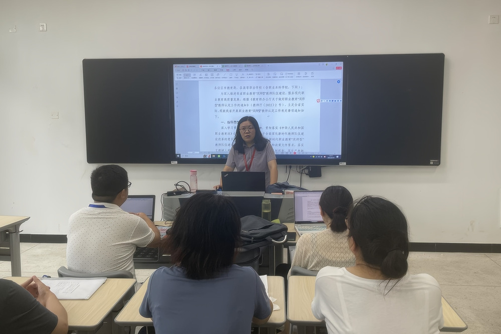 参会老师一起学习《江苏省职业教育“双师型”教师标准(试行)》文件,明确了“双师型”教师认定坚持师德师风第一标准,师德考核不合格者影响期内不得参加认定,已认定的要予以撤销;要强化教师教学水平、专业技能、实践经验和社会服务能力要求,注重教育教学改革和专业发展实绩。强调要落实“双师型”教师的责任义务。经认定的“双师型”教师,仍应积极参加行业企业实践和继续教育培训,在教学业绩、教育研究、专业实践、社会服务等方面产生新成果,发挥好“传帮带”作用,学校应将上述表现作为“双师型”教师考核、认定或续聘(校外兼职教师)的重要依据。大家根据文件内容分析了认定初级、中级与高级“双师型”教师所需要的具体条件,并根据个人情况填报认定工作的预登记表。