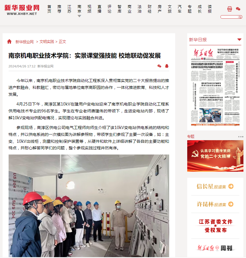 4月25日下午,高淳区某10kV在建用户变电站迎来了南京机电职业学院自动化工程系供用电技术专业的96名学生。学生在专业老师唐建伟的带领下,走进变电站内部,现场了解10kV变电站供配电情况,实现理论与实践融合共进。