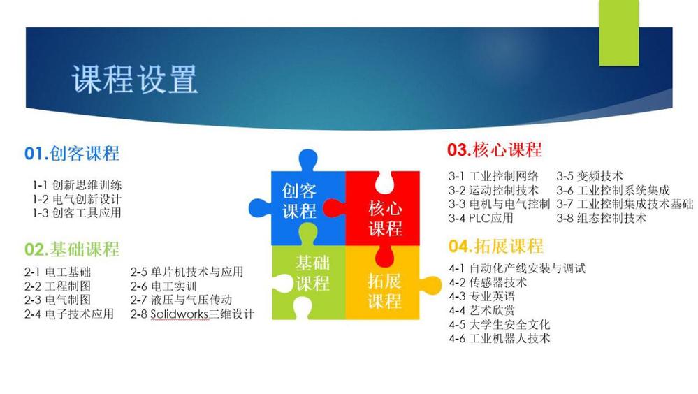 《电工基础》《电子技术》《电机与电气控制》《PLC应用技术》《工业控制系统集成》《组态控制技术》《运动控制技术》《变频技术》《气动技术》《电气制图》《工程制图》《单片机技术及应用》《电气创新设计》等。
