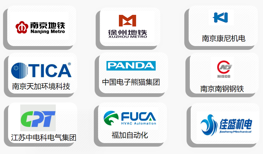 西门子中国有限公司、南京康尼电气股份有限公司、南京康尼机电股份有限公司、南京福加自动化有限公司、南京地铁运营有限公司、南京钢铁集团有限公司、南京天加环境科技有限公司、徐州地铁集团有限公司、南京中电熊猫平板显示科技有限公司、南京新联电子股份有限公司、中海物业管理有限公司南京分公司、南京中电熊猫液晶材料科技有限公司、江苏中电科电气有限公司、扬子江药业集团有限公司等。